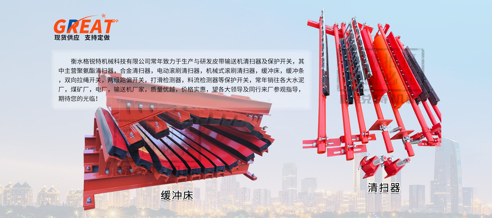 衡水格銳特機(jī)械科技有限公司常年致力于生產(chǎn)與研發(fā)皮帶輸送機(jī)清掃器及保護(hù)開關(guān),其中主營聚氨酯清掃器,合金清掃器,電動(dòng)滾刷清掃器,機(jī)械式滾刷清掃器,緩沖床,緩沖條,雙向拉繩開關(guān),兩級跑偏開關(guān),打滑檢測器,料流檢測器等保護(hù)開關(guān),常年銷往各大水泥廠,煤礦廠,電廠,輸送機(jī)廠家,質(zhì)量優(yōu)越,價(jià)格實(shí)惠,望各大領(lǐng)導(dǎo)及同行來廠參觀指導(dǎo),期待您的光臨!!!